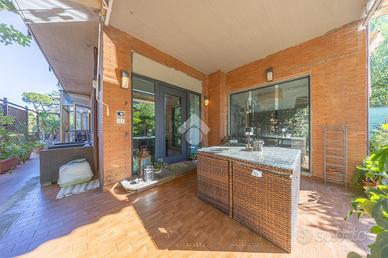 -al piano terra abbiamo l'ingresso dal giardino privato con ampio portico, luminoso soggiorno con camino e grande vetrata, angolo cottura con isola moderna ed elegante, bagno con doccia e finestra;