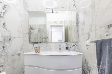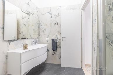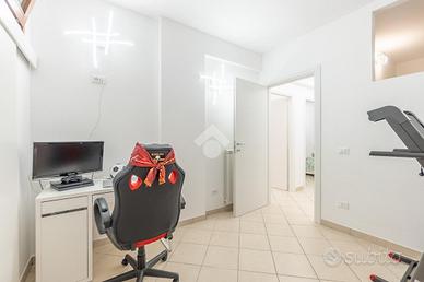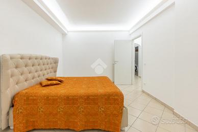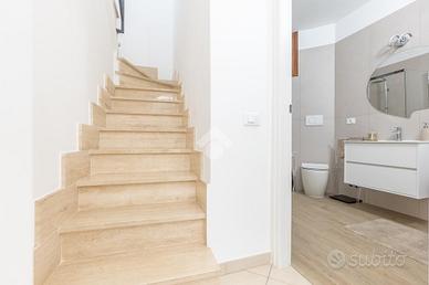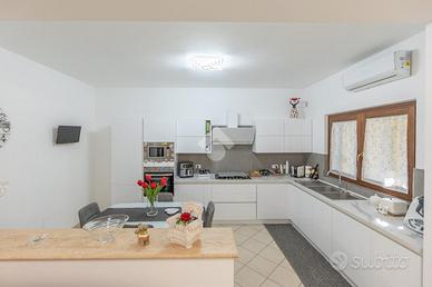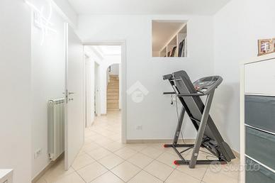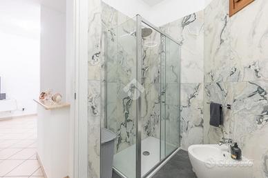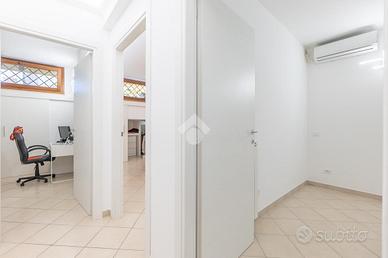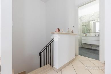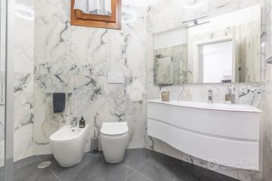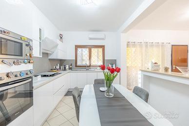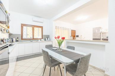 Al piano inferiore si estendono tre camere da letto, la cabina armadio, rispostigli, ed un ulteriore bagno con doppio box doccia. L'immobile si presenta in ottimo stato, è fornito di condizionatori, tenda da sole e grate di sicurezza.