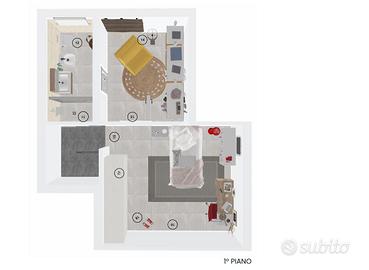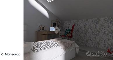 Al primo piano mansardato abitabile abbiamo una grande camera con accesso al balcone, una cabina armadio e un bagno con doccia finestrato;