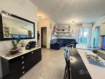 Al piano terra si accede a una zona giorno ben organizzata, composta da un accogliente soggiorno e da una cucina separata, entrambi con affacci diretti sul giardino. Completano il livello un pratico antibagno e un bagno finestrato con doccia, a servizio della zona giorno.