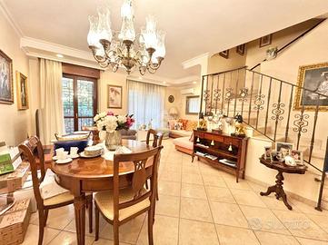 FONTE LAURENTINA, Via Eugenio Bertini, in piena proprietà, disponiamo di un villino a schiera, costruzione 2006, disposto su 4 livelli e così composto: al piano d'ingresso troviamo una cucina abitabile , un ampio soggiorno ed un bagno di servizio; salendo tramite delle comode e spaziose scale in marmo, arriviamo alla zona notte composta da una camera matrimoniale, 2 camere singole, un ampio bagno finestrato ed un ripostiglio/guardaroba dotato anche di doccia; salendo ancora di un piano, troviamo una mansarda comoda a destinazione non abitativa, con balcone di servizio e altezze che la rendono assolutamente utilizzabile. Al piano seminterrato, direttamente collegato dall'interno alla casa, troviamo una sala hobby ed un grande box di 36 mq. Il villino è in buono stato interno, con bagni originali ma ben tenuti; le pavimentazioni delle camere sono in parquet, il riscaldamento è autonomo ed è dotato di grate e zanzariere; oltre ai due giardini pavimentati rispettivamente di 30 e 50 mq, l'immobile è dotato di 2 balconi ai piani superiori e di due patii vivibili ed attrezzabili da sfruttare nei periodi primaverili ed estivi. Le spese di condominio e supercondominio ammontano a 70 euro mensili totali. La casa è ideale per famiglie con bambini, per chi possiede animali domestici e per chi desidera una soluzione indipendente. Non necessita di affrancazione. Il venditore necessita di un preliminare di almeno 40/50.000,00 Euro.