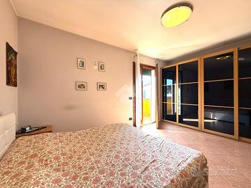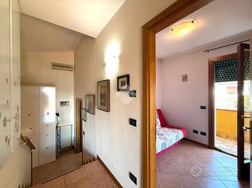 Al piano superiore si sviluppa la zona notte con un generoso bagno finestato ristutturato, camera matrimoniale e camera singola, ripostiglio e terrazzi a servizio delle camere.
