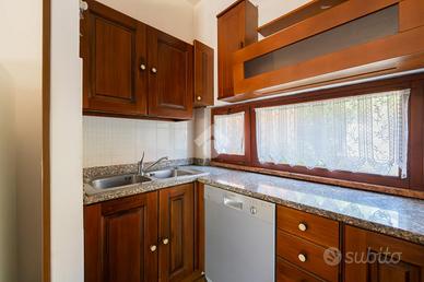Al piano terra, la zona giorno è composta da un soggiorno accogliente con angolo cottura, ideale per momenti conviviali e familiari, accompagnata da un bagno completo con doccia e sanitari in ceramica, curato nei dettagli e funzionale. Entrambi i lati dell'abitazione si affacciano su giardini privati, perfetti per chi desidera godersi il verde e la tranquillità, o per chi possiede animali domestici.