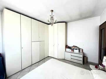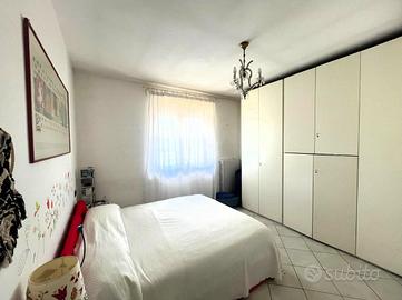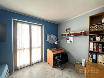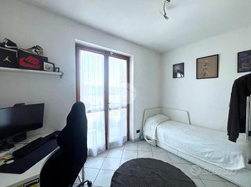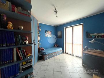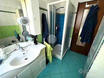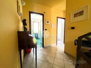 Al primo piano, il disimpegno conduce alla zona notte composta da una cameretta con balcone affacciato sul giardino anteriore, una camera matrimoniale e una seconda cameretta con balcone che si affaccia sul giardino posteriore oltre che un bagno finestrato con doccia.