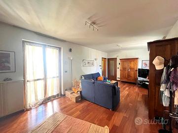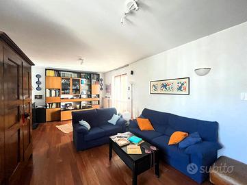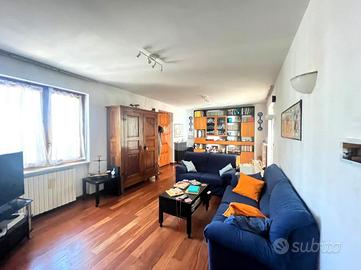 Al piano terra troviamo un luminoso soggiorno con parquet in ciliegio e ampia porta finestra che conduce al giardino privato, completo di tende estive, ideale per godersi pranzi e cene all'aperto nelle belle giornate.