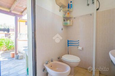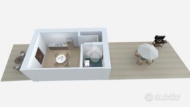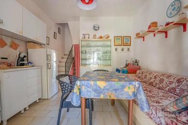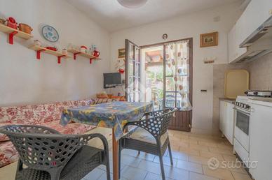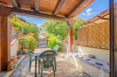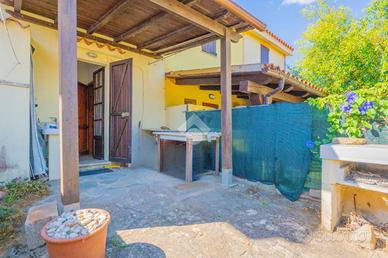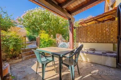 Questa villetta, disposta su due livelli, presenta all'ingresso un comodo giardino con pergola in legno, spazio ideale dove mangiare all'esterno. Da qui si accede all'interno, dove è presente lo spazio per un tavolo, un divano e la zona cottura a parete. Dal disimpegno al piano si accede al bagno finestrato ed al giardino sul retro, un'ulteriore spazio verde di pertinenza della casa, dove la proprietà ha realizzato una zona barbecue.
