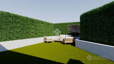 * Soggiorno con cucina a vista e grandi vetrate affacciate sul giardino