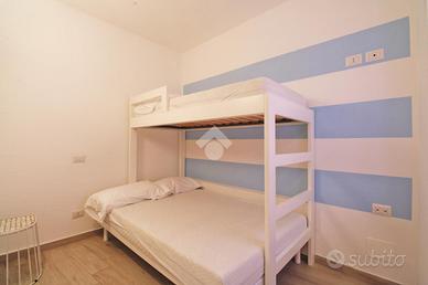L'ingresso si apre su un'accogliente zona giorno open space, perfetta per trascorrere momenti di relax in compagnia. Un piccolo ripostiglio aggiunge praticità a questo spazio ben organizzato. Al primo piano, un bagno moderno con doccia e una camera dotata di letto a castello.