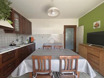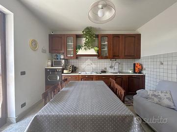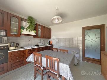 L'ingresso al piano terreno accompagna al salone impreziosito da un camino a pellet e alla cucina abitabile con affaccio sul cortile esterno. A completare la zona giorno un bagno di servizio finestrato.