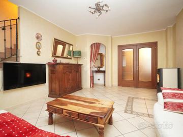 In zona residenziale, a pochi chilometri dal centro di Susa e dai suoi principali servizi. La costruzione è parte di un piccolo contesto di villette realizzate nei primi anni del 2000. I tre lati dell'abitazione si affacciano in aderenza all'area verde di circa 250 metri quadrati, interrotti parzialmente dalla rampa carraia che dà accesso all'autorimessa del piano interrato. L'ingresso è posizionato al di sotto di un porticato e si apre direttamente sul soggiorno. La cucina è abitabile e l'angolo cottura allestito è fatto su misura in muratura. Inoltre è presente una dispensa dotata di attacchi per una lavatrice. Il disimpegno guida verso il bagno di servizio della zona giorno, dotato di doccia e finestra di areazione. Ogni piano è servito internamente da rampa scala interna in muratura. La zona notte è distribuita al primo piano. La camera principale ha dimensioni generose e si affaccia su due balconi. Il bagno è finestrato ed è stato installato al suo interno una vasca idromassaggio. La seconda camera ha come pertinenza esterna un terrazzo sul lato espositivo maggiormente esposto al sole. La scala interna collega la stanza direttamente con il locale sgombero mansardato posto nel sottotetto. Quest'ultimo ambiente è stato rifinito nei dettagli ed offre una valida opportunità di spazio ulteriore ai vani principali della casa. Nel seminterrato, oltre all'autorimessa è presente una tavernetta con angolo cottura in muratura ed un locale sgombero rappresentato dal sottoscala. Su tutto l'immobile è stato installato un allarme perimetrale e volumetrico.