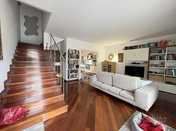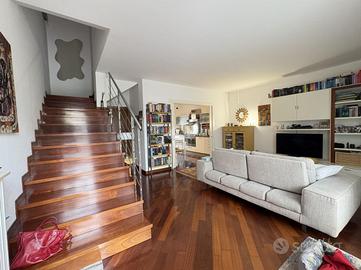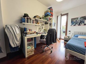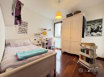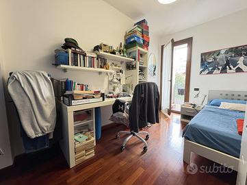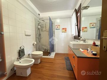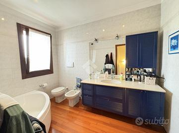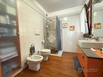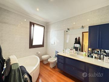 Al piano primo raggiungiamo la zona notte, la quale è composta da una camera matrimoniale di 15 mq con uscita su un poggiolo, le due camere singole rispettivamente di 11 mq, entrambe collegate ad un secondo poggiolo e il bagno finestrato con vasca anch'esso con uscita sul poggiolo.