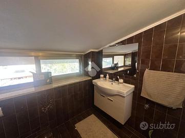 L'ingresso si apre su un luminoso soggiorno con angolo cottura, e la zona notte del piano ospita una camera matrimoniale con bagno privato e accesso diretto a un secondo terrazzo.
