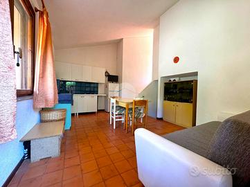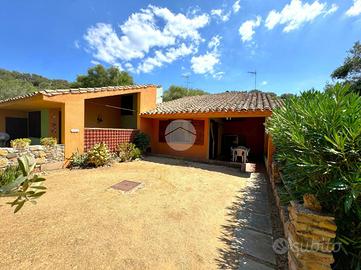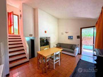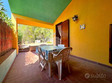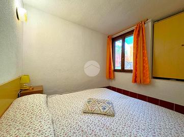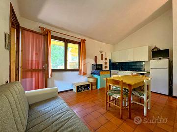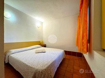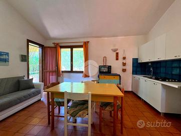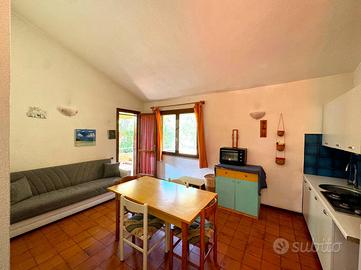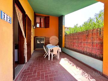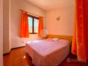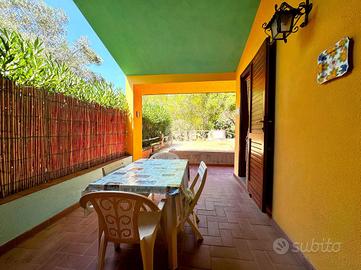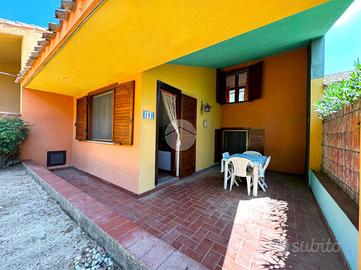 VILLASIMIUS - All'interno del condominio 'Porto Luna 1', complesso residenziale ricco di verde ben curato e dotato di piscina, villetta con giardino a 200 metri dalla spiaggia. Posteggiata l'auto in uno dei numerosi stalli condominiali poco distanti dall'immobile, percorso un brevissimo corsello comune alla schiera di tre di cui fa parte l'immobile in oggetto, si arriva all'ingresso della proprietà privata. Frontalmente, la proprietà, presenta un giardino di buone dimensioni su cui affaccia l'ampia veranda coperta disposta a 'L', utile a trascorrere piacevoli momenti di convivialità al riparo dal calore del sole estivo. Varcata la soglia d'ingresso, si viene accolti da un pranzo-soggiorno di forma regolare che ospita sul fronte la parete cottura di recente installazione, un tavolo da pranzo, divano e TV.