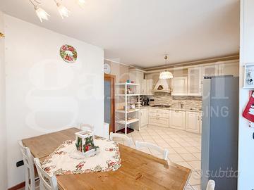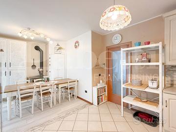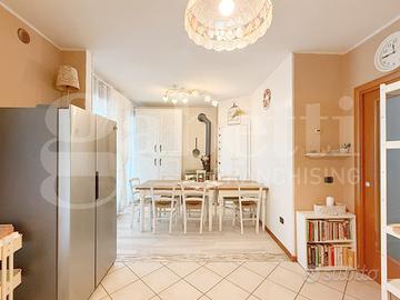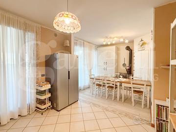 Soggiorno spazioso dotato di affaccio sul giardino privato ed impreziosito dalla stufa a legna che riscalda l'ambiente. Ampia cucina abitabile con adiacente garage (nell'abitazione spazio recuperato come sala da pranzo e accanto lavanderia). Un bagno cieco completo di tutti i sanitari divide i due ambienti.