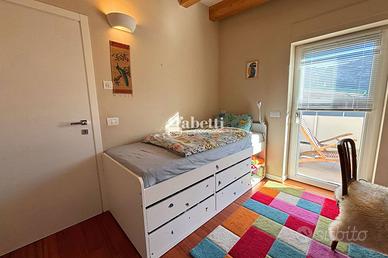 Al piano terra la zona giorno è luminosa e funzionale, con soggiorno e cucina affacciati sul giardino, un bagno finestrato e un comodo ripostiglio. Salendo al piano superiore si entra nella zona notte, pensata per offrire riservatezza e quiete: due camere da letto si affacciano sull'ampio terrazzo panoramico con una bellissima vista aperta, uno spazio che amplia naturalmente la zona notte verso l'esterno, mentre la terza camera, perfetta come cameretta o studio, ha accesso a un ulteriore ampio balcone che aggiunge luce e respiro. Il piano è completato da un secondo bagno finestrato dotato di vasca e doccia, anch'esso con apertura diretta sul balcone.