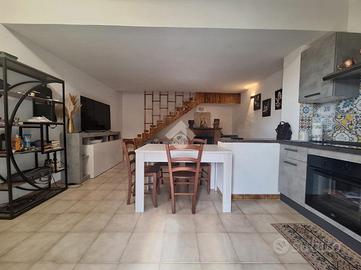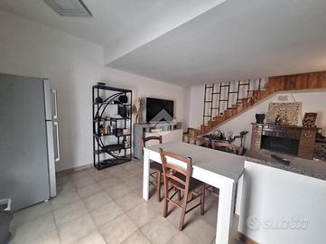 Al primo piano, la zona giorno si apre in un unico spazio luminoso e armonioso, impreziosito da un camino che crea un'atmosfera calda e intima.