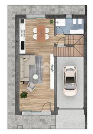 Sviluppata su due livelli, al piano terra troveremo la zona giorno open space, un bagno, il garage e un'area esterna privata a giardino che garantirà privacy e spazi da vivere all'aperto.