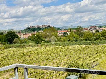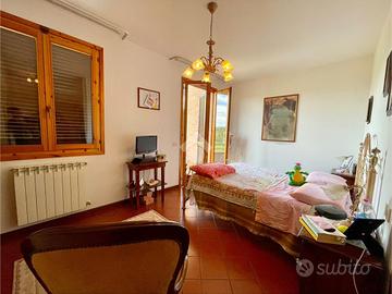 Al primo piano la zona notte ospita una camera matrimoniale e una camera singola, entrambe con accesso a terrazze abitabili e un bagno finestrato. In particolare, la terrazza della matrimoniale offre una vista aperta e suggestiva sulla campagna e sul caratteristico profilo del borgo.
