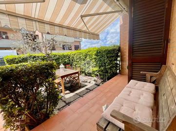 L'accesso avviene tramite un ampio resede piastrellato, ideale per pranzi all'aperto o momenti di relax in famiglia. Dal resede si entra direttamente nel soggiorno, ampio e luminoso, grazie alla grande portafinestra che garantisce un'ottima luce naturale e un collegamento diretto con l'esterno.