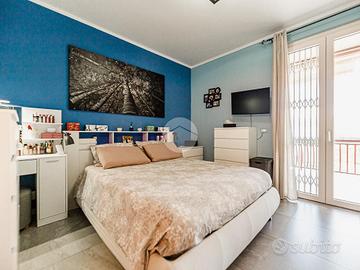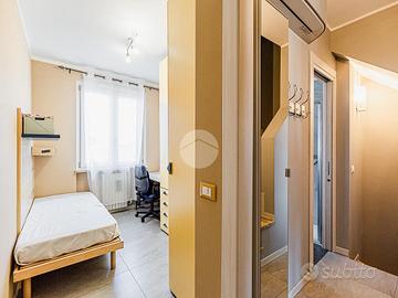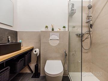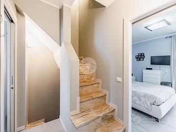 Un'elegante scala in marmo conduce al primo piano che ospita la zona notte, dove troviamo due camere da letto, di cui una matrimoniale con accesso diretto al terrazzo esclusivo, e da un ampio servizio finestrato completo sia di vasca che di doccia.