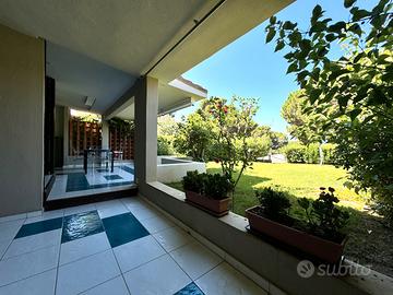 Aspetti fondamentali della soluzione sono la buona panoramicità, il contesto arioso e l'estrema vicinanza al mare; si sottolinea, inoltre, che compresa nelle spese condominiali c'è la cura del giardino privato.