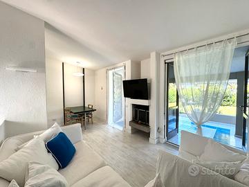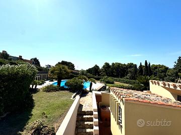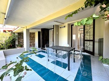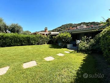 VILLASIMIUS - A soli 250 metri dalla splendida baia di 'Campulongu', in contesto condominiale immerso nel verde curato e dotato di piscina, villetta a schiera con ampio giardino privato e vista mare.