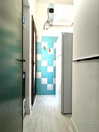 Frontalmente alla zona giorno, trova spazio un elegante cucinotto con parete cottura moderna e su misura, adiacente al quale è presente una piccola dispensa in cui è stato posizionato il frigorifero.