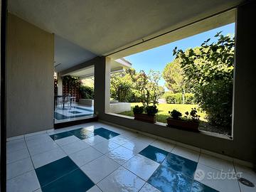 Una luminosa zona giorno con camino, dotata di zona pranzo con tavolo a scomparsa e angolo relax con divani e tv, affaccia su una doppia veranda di generose dimensioni, ideale per rilassarsi nelle ore più calde della giornata, che guarda sul curatissimo giardino verde da cui si può godere di uno scorcio di vista mare.