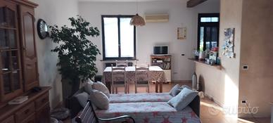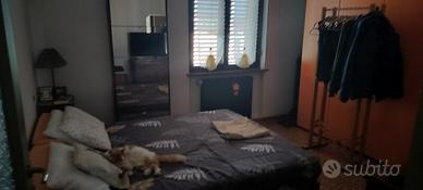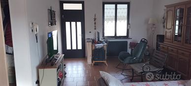 villa a schiera su 2 piani. A pian terreno ampio garage + cantina + bagno servizio; al 1° piano soggiorno e cucina open space, al 2° piano 2 camere da letto + 1 bagno.