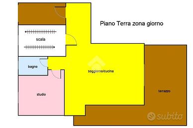 - piano terra: ingresso, soggiorno ampio con cucina a vista, terrazzo, bagno e studio