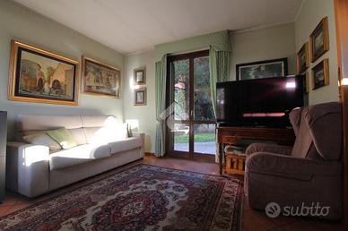 Al piano terra si trovano un ampio e luminoso soggiorno con accesso al portico e al giardino sul retro, corridoio che conduce a una cucina abitabile che può ospitare un tavolo per 6 persone, servita da portafinestra che dà accesso al portico sul retro, e bagno di servizio finestrato.
