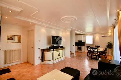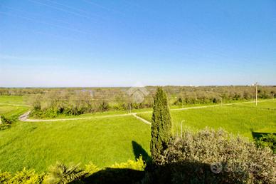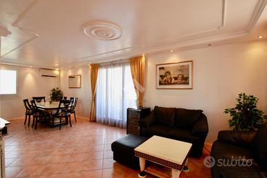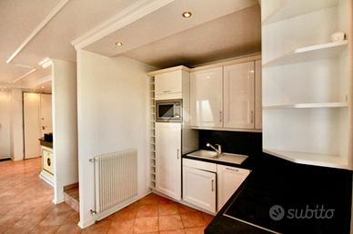 Al piano primo troviamo subito la zona giorno, luminosa e con mobilio in legno, doppio divano e mobile tv, ed è direttamente comunicante con l'ampio terrazzo vista laguna. Oltrepassando la zona giorno, abbiamo la zona pranzo dotata di cucina e tavolo apribile con la capacità di ospitare 6/8 persone. Salendo la rampa di scale, accediamo alla zona notte, che si sviluppa al piano secondo. Frontalmente rispetto al vano scale, troviamo la seconda camera da letto matrimoniale, attualmente arredata con divano, armadio e mobile tv, con accesso diretto al terrazzino abitabile, che si affaccia sul fronte dell'edificio ed il bagno finestrato, dotato di sanitari e vasca. Sulla sinistra, invece, troviamo la camera da letto padronale completa di armadio, mobile tv e due comodini, molto luminosa grazie a
