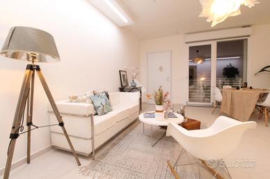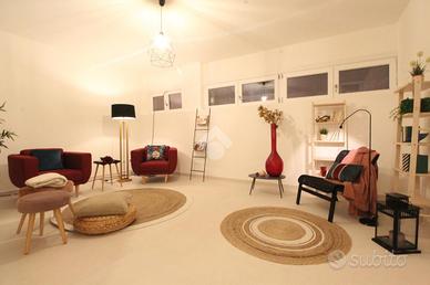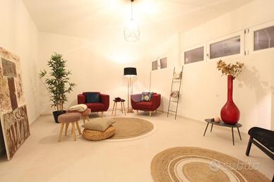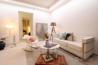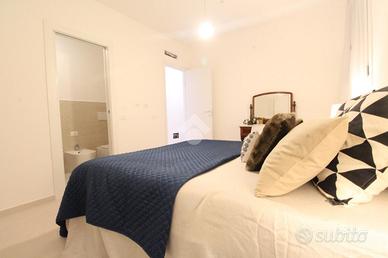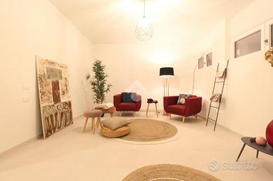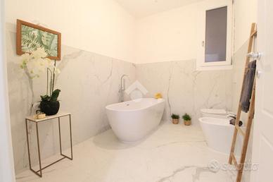 Salone con cucina a vista, due matrimoniali, due bagni al piano.