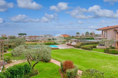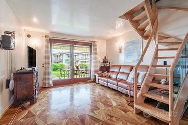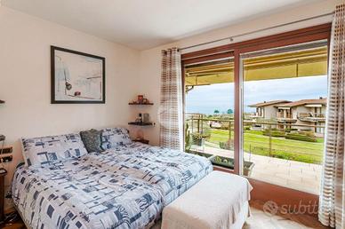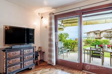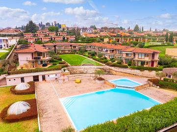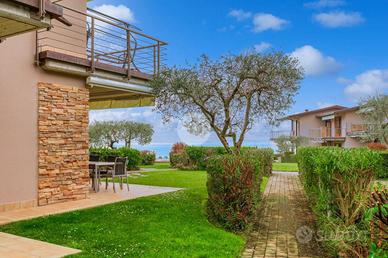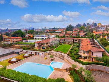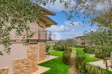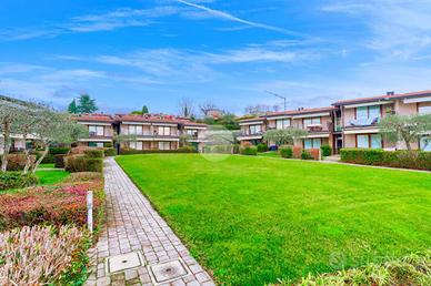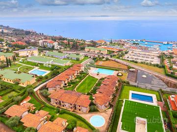 MONIGA DEL GARDA :Ubicata in posizione spettacolare a soli 100 metri dal porto di Moniga del Garda, uno dei più suggestivi del Lago di Garda, e a breve distanza dal centro storico, questa elegante villetta è inserita in un residence esclusivo con piscine e spazi comuni curati, ideale per vivere appieno il lago in un contesto riservato e di pregio L'immobile si sviluppa su due livelli ed è circondato su tre lati da un giardino privato di circa 200 mq dal quale si gode di una piacevole vista lago. Il piano terra ospita una luminosa zona living con splendida vista e accesso diretto al giardino, una cucina abitabile separata e un bagno finestrato completo di lavatrice. Tutti gli ambienti del piano hanno accesso diretto allo spazio esterno, rendendo la casa particolarmente funzionale e vivibile Un'elegante scala in legno conduce al primo piano composto da una camera matrimoniale, una seconda camera attualmente adibita a studio e una camera padronale con bagno privato completo di vasca e box doccia con funzione idromassaggio. Il piano è completato da un secondo bagno con doccia. Tutte le camere dispongono di terrazzo esclusivo e dalla camera padronale e dalla seconda camera si può godere di una vista lago mozzafiato Le finiture interne sono di alto livello con pavimenti in parquet di quercia antica, stucco veneziano, rivestimenti in marmo nei bagni e in cucina, porta blindata e serramenti in legno con doppio vetro e sistema antisfondamento. L'immobile è dotato di riscaldamento autonomo a pavimento, aria condizionata nella zona notte, cappotto esterno per un migliore isolamento termico, impianto di allarme volumetrico con sei telecamere gestibili da remoto e impianto TV terrestre e satellitare ASTRA in tutte le stanze. Completano la proprietà due box auto nell'interrato e due piscine condominiali con impianto di videosorveglianza. Soluzione ideale come prima casa, residenza esclusiva per le vacanze o investimento in una delle località più richieste del Lago di Garda