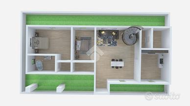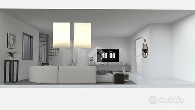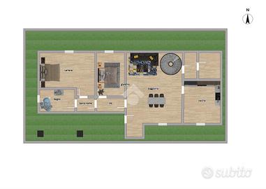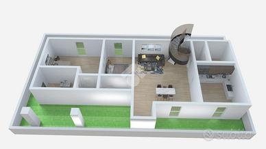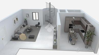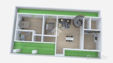 Al piano terra vi è un'ampia e luminosa zona giorno living oltre doppi servizi e zona notte con due camere da letto. Zona terrazzata esterna con giardino privato.