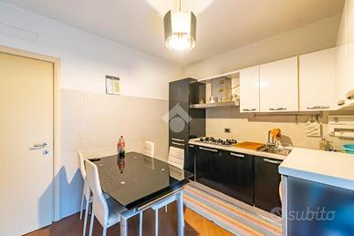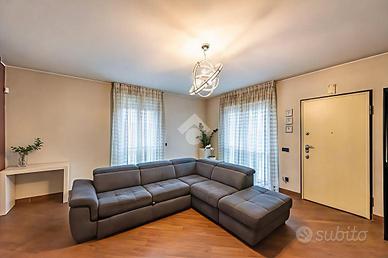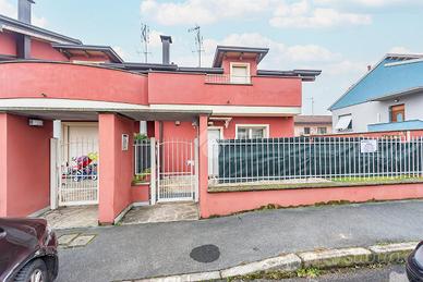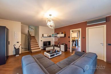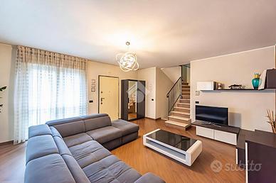 Elegante villetta a schiera di testa con ingresso indipendente, situata in un contesto residenziale tranquillo, circondata da edifici a bassa altezza.