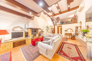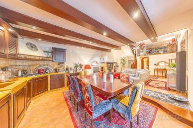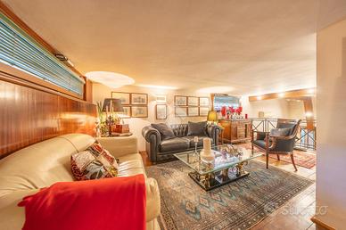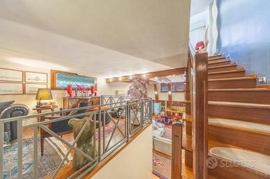 Il vero cuore della casa si rivela però al piano seminterrato, dove prende vita una suggestiva sala hobby dal fascino inconfondibile. Qui troviamo una cucina a vista con zona pranzo, un ampio spazio soggiorno con camino e una zona soppalcata dedicata al relax, che affaccia direttamente sulla sala sottostante. Completa il livello una camera con bagno privato, uno studio e un ulteriore bagno di servizio.