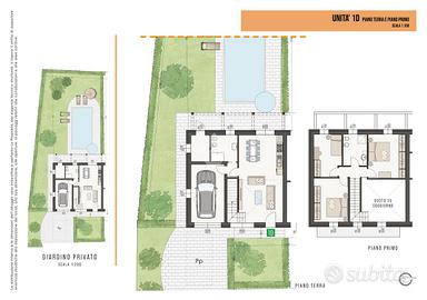 La villa si sviluppa su due livelli fuori terra e gode di ingresso indipendente con giardino privato su tre lati, ideale per chi cerca privacy e spazi all'aperto da vivere in ogni stagione.