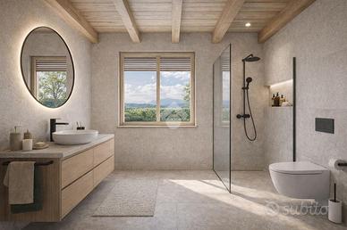 Riscaldamento autonomo a pavimento (diviso per zone) tramite pompa di calore alimentata da impianto fotovoltaico privato di 6 Kw, impianto di climatizzazione canalizzato, tapparelle e basculante box elettriche, solai e tetto in legno a vista, serramenti in Pvc color legno di rovere con triplo vetro fonoassorbente, impianto elettrico frutti Biticino serie Living, termoarredi elettrici nei bagni con sanitari sospesi e capitolato di alta qualità per la scelta di pavimentazioni in grès porcellanato o parquet. Possibilità permuta del vostro immobile usato.
