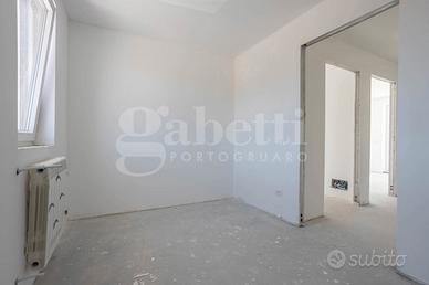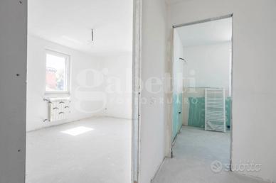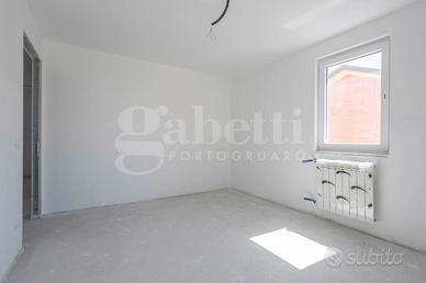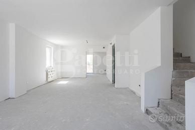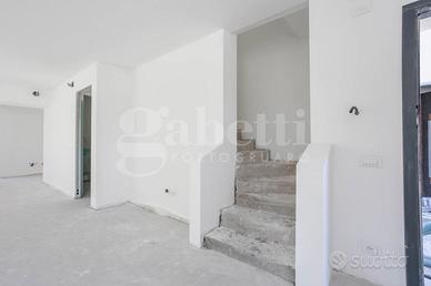L'ingresso si apre direttamente sulla zona giorno ampia, luminosa con la cucina a vista, ma separata rispetto al soggiorno, così da mantenere un ambiente funzionale senza rinunciare all'apertura degli spazi. Da qui si accede direttamente al piccolo giardino sul retro, perfetto per rilassarsi all'aperto, cenare in estate o semplicemente godersi un po' di verde.