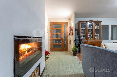 Al piano terra troviamo un caldo ingresso con caminetto, elemento che dona carattere all'abitazione e che funge da collegamento tra la cucina abitabile e il soggiorno singolo. Un disimpegno conduce poi a una cantina di ampie dimensioni. Esternamente, sempre al piano terra, sono presenti la centrale termica e alcuni vani ad uso magazzino e lavanderia, comodi e versatili.