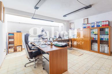 Al piano seminterrato troviamo un'ampia area versatile, oggi utilizzata come studio con bagno, affiancata da due utili ripostigli e da un box auto di circa 30 mq, ideale per auto e moto o come ulteriore spazio di deposito.