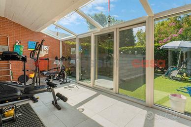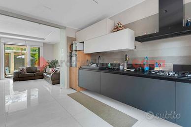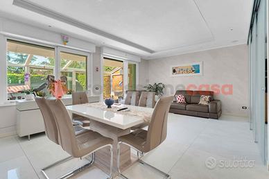 Dal portico privato al piano terra si accede all'ingresso che porta all'ampia zona living con accesso tramite ampia vetrata al giardino di proprieta', una grande cucina abitabile con accesso al patio privato e bagno di servizio. Tramite comoda scala di comunicazione al primo piano troviamo la zona notte con con doppi servizi,2 camere da letto e ampia mansarda sottotetto con armadiature su misura.