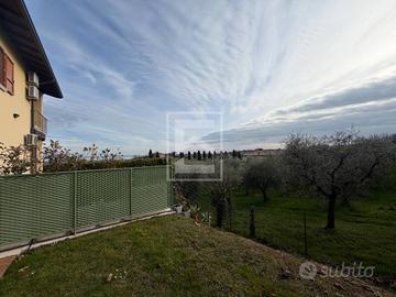 Al piano terra si trova una zona giorno di generose dimensioni, particolarmente luminosa, con cucina a vista e bagno di servizio. Gli ambienti si aprono sui due giardini privati, uno frontale e uno sul retro, entrambi ideali per vivere gli spazi esterni in totale privacy; dal giardino posteriore la vista lago e sugli uliveti risulta particolarmente suggestiva.