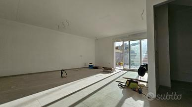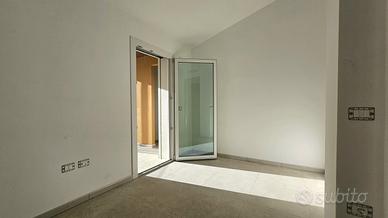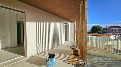 Entrando, al piano terra, veniamo accolti da una zona living con angolo cottura che conquista subito lo sguardo: lo spazio è grande, aperto, senza barriere ma soprattutto luminosissimo. Le grandi vetrate lasciano entrare la luce in ogni momento della giornata e la continuità con il giardino sul retro crea un'atmosfera rilassante. Qui il tempo sembra scorrere un po' più lento. Subito fuori, la veranda coperta diventa il naturale prolungamento del soggiorno: perfetta per un pranzo all'aperto, per far giocare i bambini all'ombra o per una cena tra amici nelle sere più miti. Una vera stanza all'aperto, da vivere tutto l'anno.
