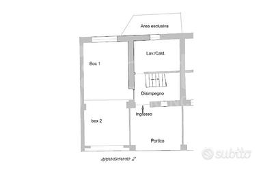 - Al piano terra: ingresso con portico coperto di 16 mq, disimpegno, locale caldaia lavanderia con un piccolo sfogo esterno di proprietà e 2 box rispettivamente da 19 e 16,5 mq).