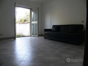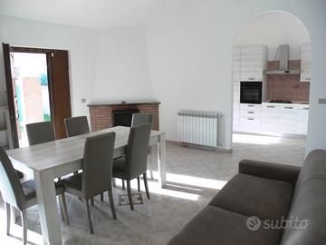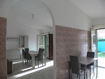 L'immobile, parzialmente arredato, è composto da un ampio salone con camino, con una porta-finestra a due ante da cui si accede al giardino e collegato da un arco alla cucina abitabile, anch'essa provvista di una portafinestra da cui si accede al portico rialzato antistante l'ingresso, dotato di porta blindata.