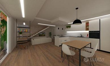 All'interno, la cucina a vista si apre sul luminoso soggiorno living, creando un ambiente accogliente e conviviale.