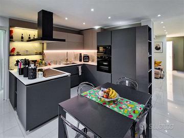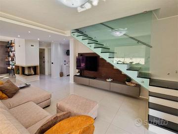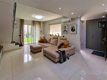 Al piano terra si viene accolti da un luminoso soggiorno open space che dialoga armoniosamente con la sala da pranzo, impreziosita da un accogliente camino, e da una cucina abitabile su misura con accesso diretto a una splendida veranda con pareti automatizzate, perfetta per pranzi e cene allaperto o per ospitare un barbecue; completano il livello una camera da letto, un bagno con doccia e una lavanderia utilizzata anche come locale tecnico, con tutti gli ambienti che godono di accesso diretto al giardino.