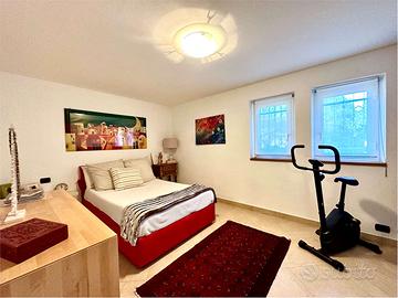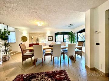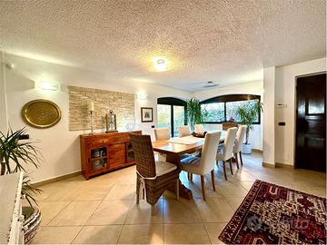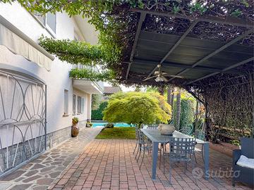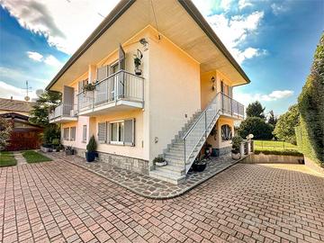 La villa si sviluppa su due livelli fuori terra e un seminterrato, per una superficie totale di più di 200 metri quadrati; allinterno della proprietà gli ambienti sono così distribuiti: il piano terra si compone di un accogliente ingresso su un ampio soggiorno con camino, zona pranzo e cucina abitabile, accesso diretto al potico e giardino. Il piano superiore accoglie la zona notte, composta da due camere da letto matrimoniali, bagno en suite, una delle quali dotata di accesso ad un balcone con vista sul giardino di proprietà, una camera da letto singola, cabina armadio ed un disimpegno. Per concludere, al piano seminterrato, si trova una spaziosa cantina e box doppio. La proprietà inoltre è dotata di posti auto scoperti ed un box doppio esterno. Labitazione è circondata da un giardino piantumato e mantenuto in ottimo stato di circa 700 metri quadri.